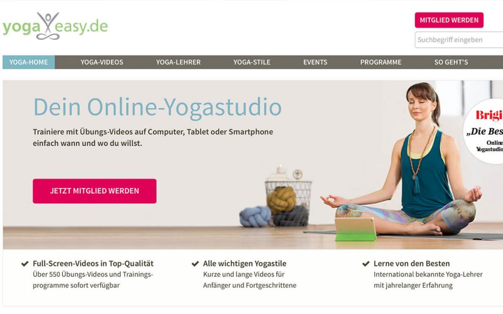 Mit YogaEasy, deinem Online-Yogastudio, kannst du Yoga üben immer und überall. Alles was du brauchst ist eine Matte und ein Computer, Tablet oder Smartphone. Eine Reihe international bekannten Yoga-Lehrern zeigen dir in Übungsvideos, wie du die verschiedensten Yoga-Übungen richtig machst. Yoga Easy wurde von der Frauen-Zeitschrift Brigitte als „Die Besten.“ im Online-Yogastudio-Test ausgezeichnet.